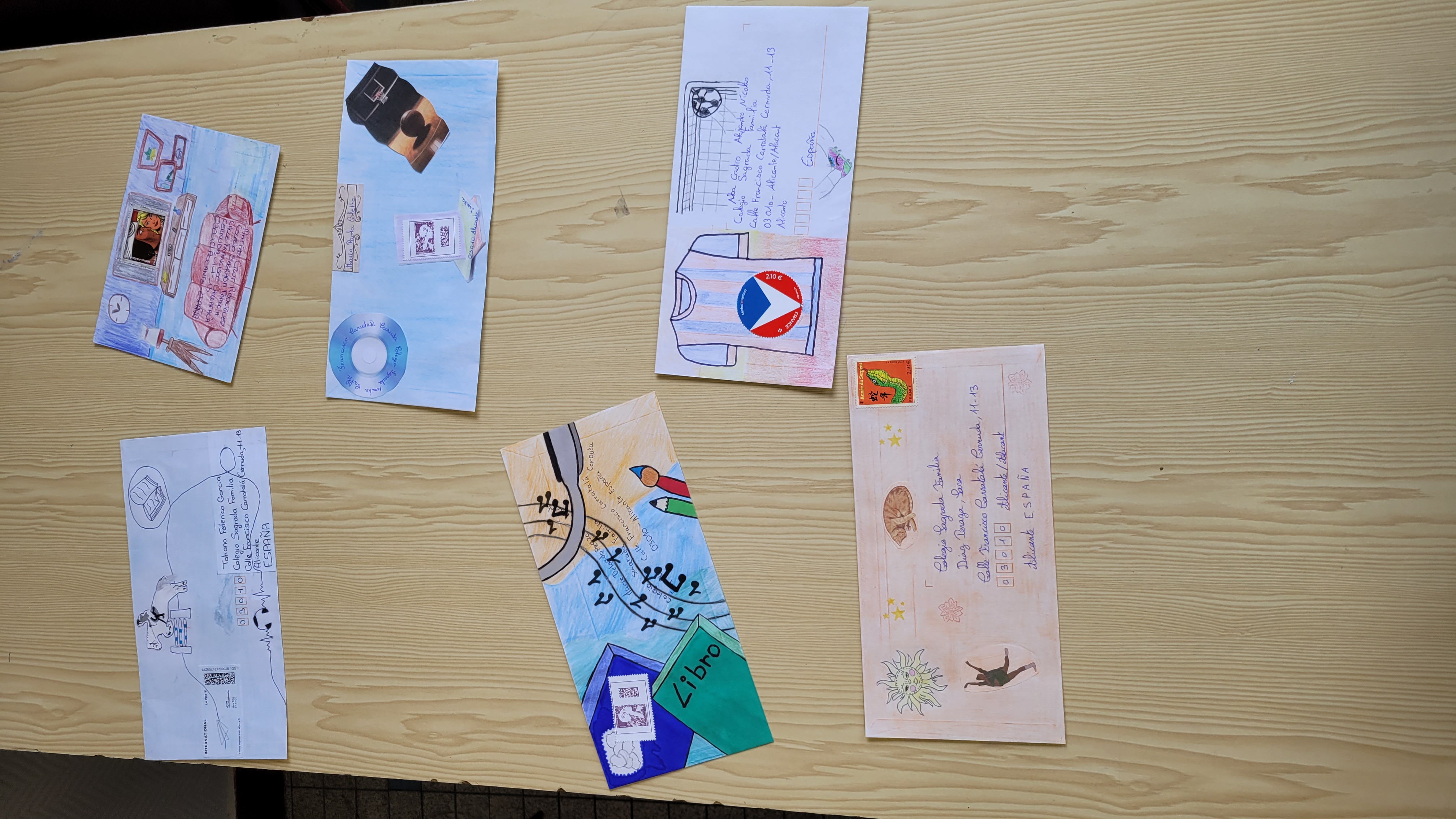 De belles enveloppes et lettres sont exposées dans le hall du collège jusqu'à fin novembre 2025. Puis ces belles enveloppes prendront leur envol direction Alicante en Espagne.