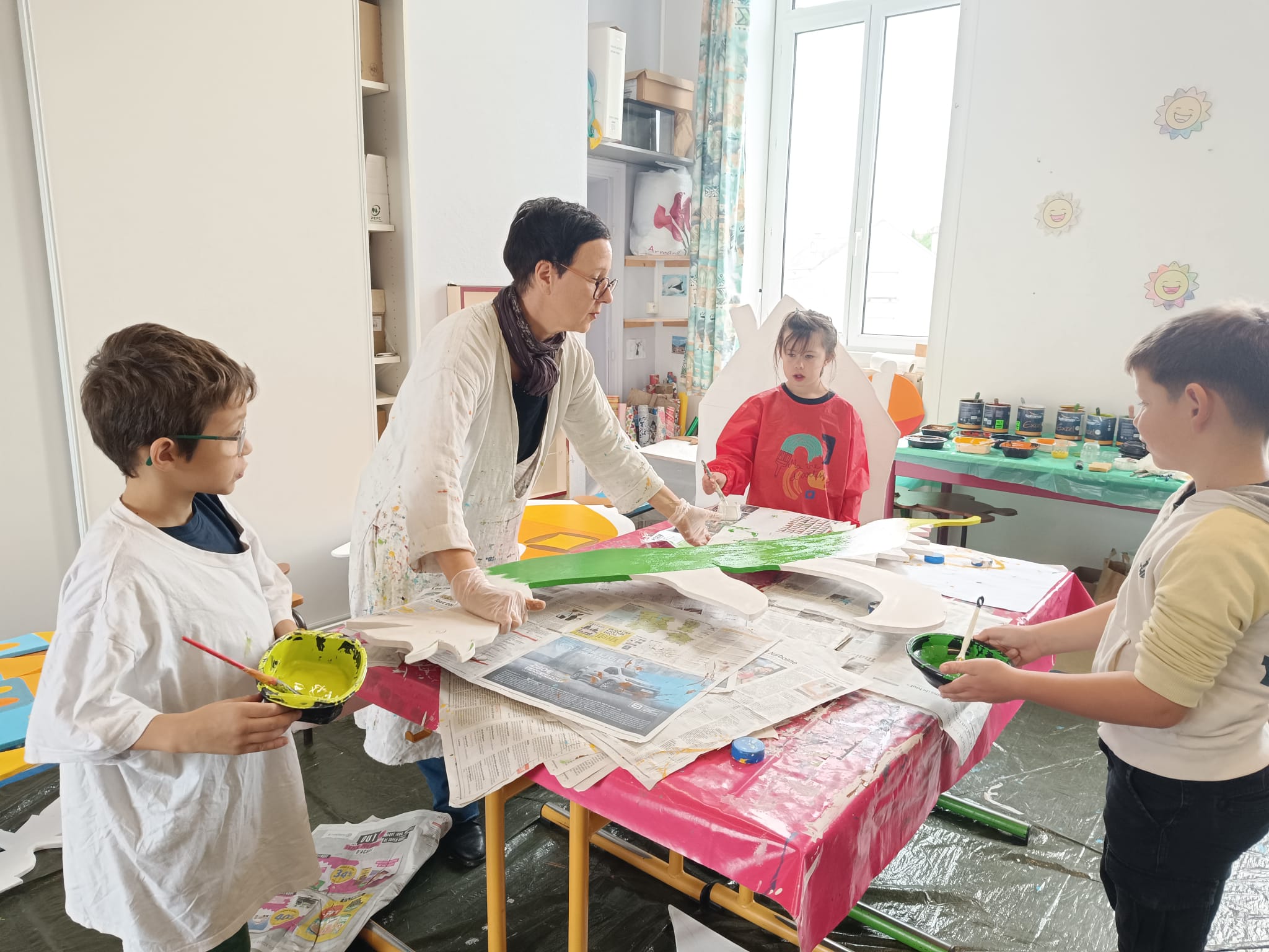 Après avoir peint les fonds, quatre classes ont eu la chance de dessiner des personnages et des éléments inspirés des contes. Aujourd’hui, une nouvelle étape a été franchie : la découpe et la mise en couleur finale des planches. Les enfants et les parents travaillent ensemble, apportant leur touche personnelle à ce projet collectif.