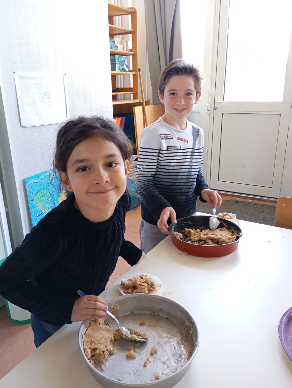 Pour mettre en pratique leurs nouvelles connaissances, ils ont eu l’opportunité de préparer un crumble, qu’ils ont ensuite partagé avec leurs camarades de la classe de CP-CE1. Ce moment de convivialité a permis aux enfants de découvrir le plaisir de cuisiner tout en renforçant les liens dans la classe.