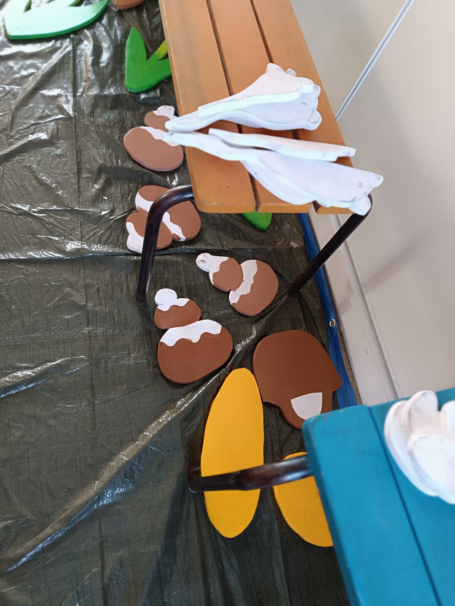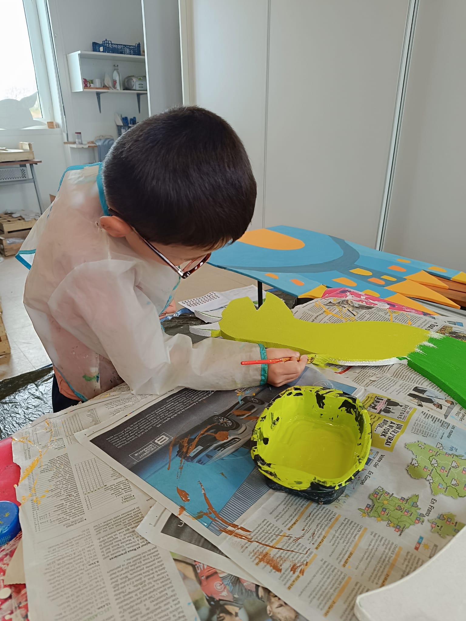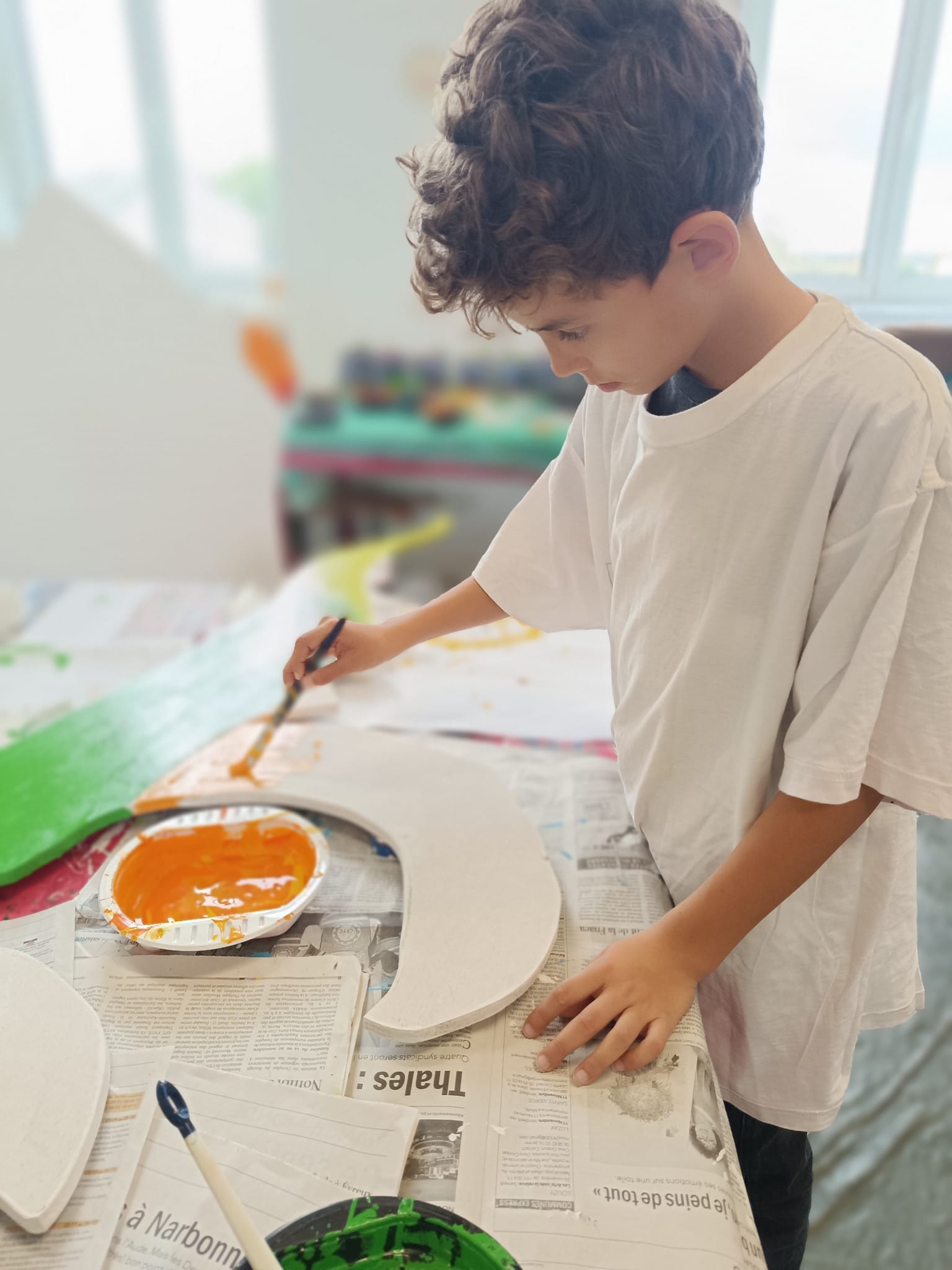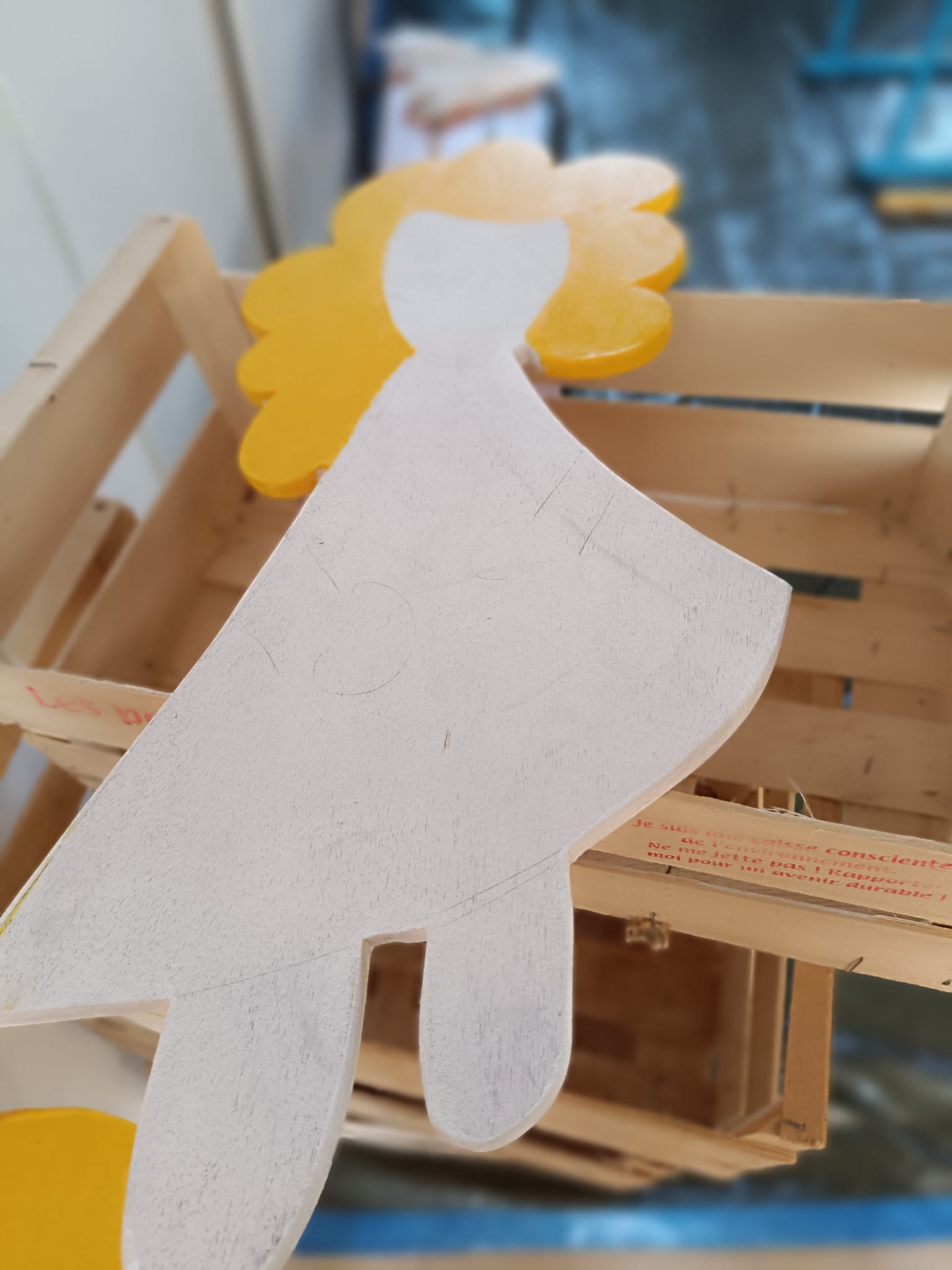 Les élèves ont dessiné des personnages, des lieux et des accessoires issus de leur imagination. Après une sélection rigoureuse, ces dessins ont été agrandis en format XXL sur des planches de bois. L’implication des familles a été essentielle, avec des parents et grands-parents participant à la découpe, au ponçage et à la peinture de la sous-couche.