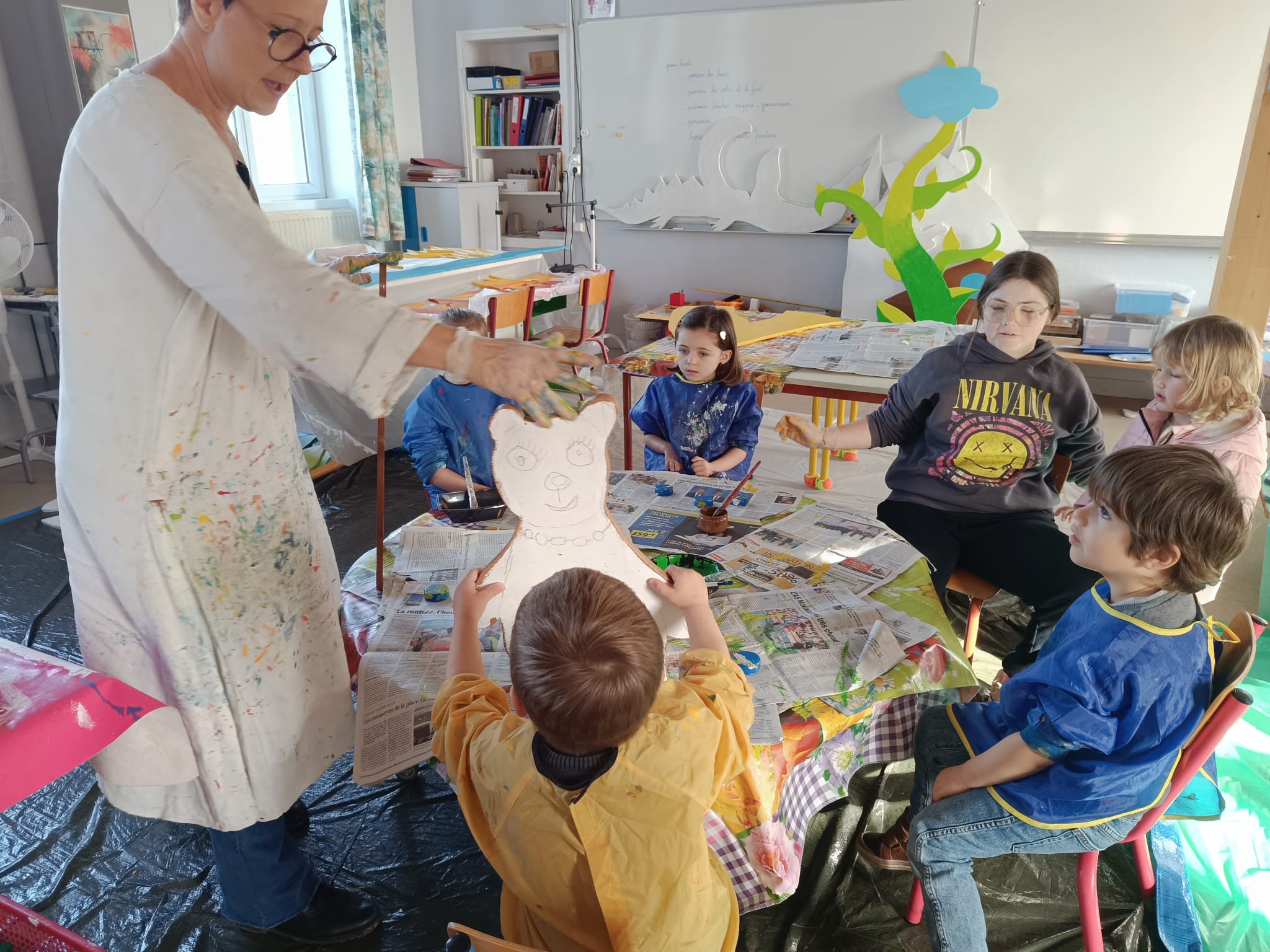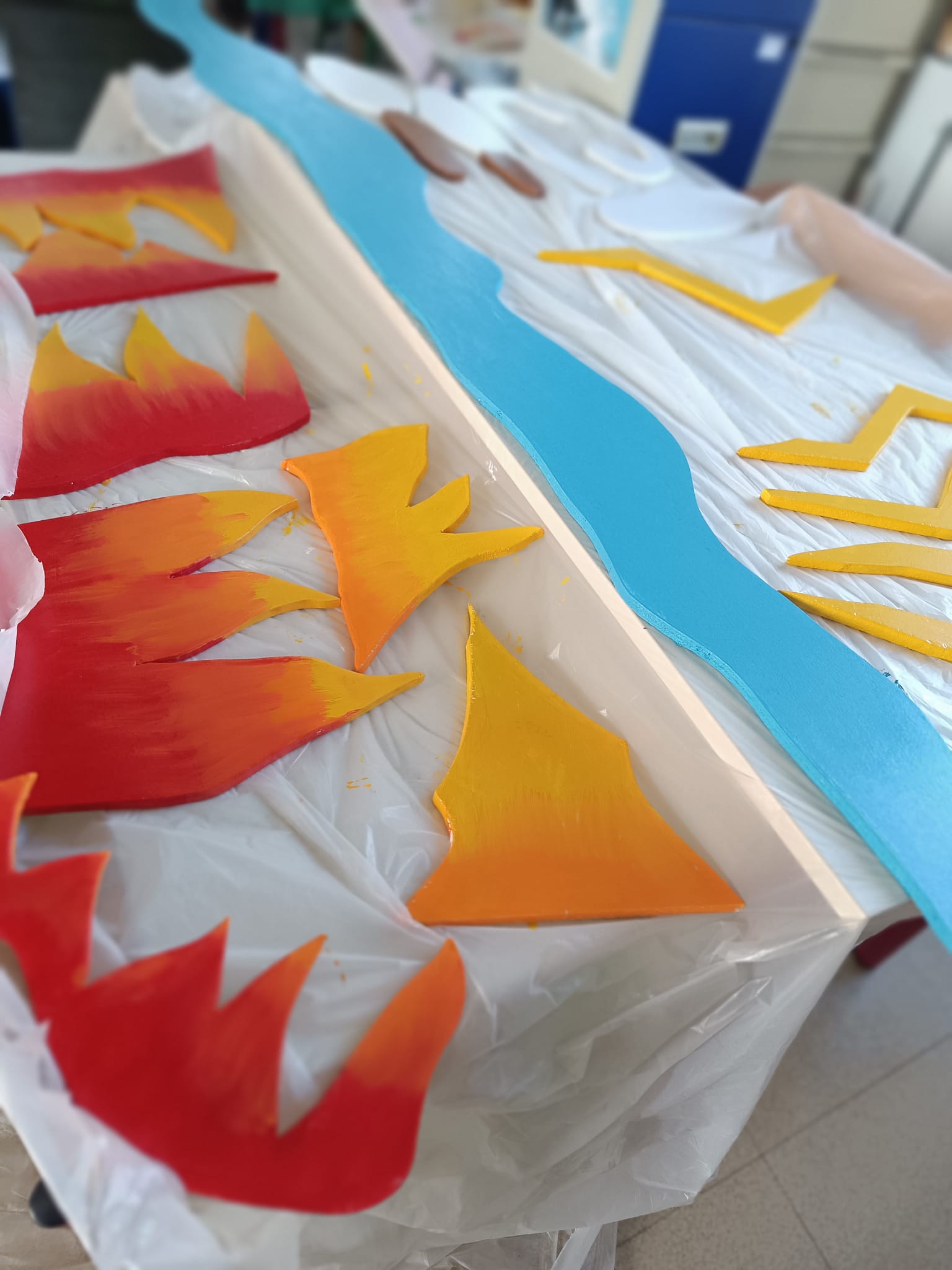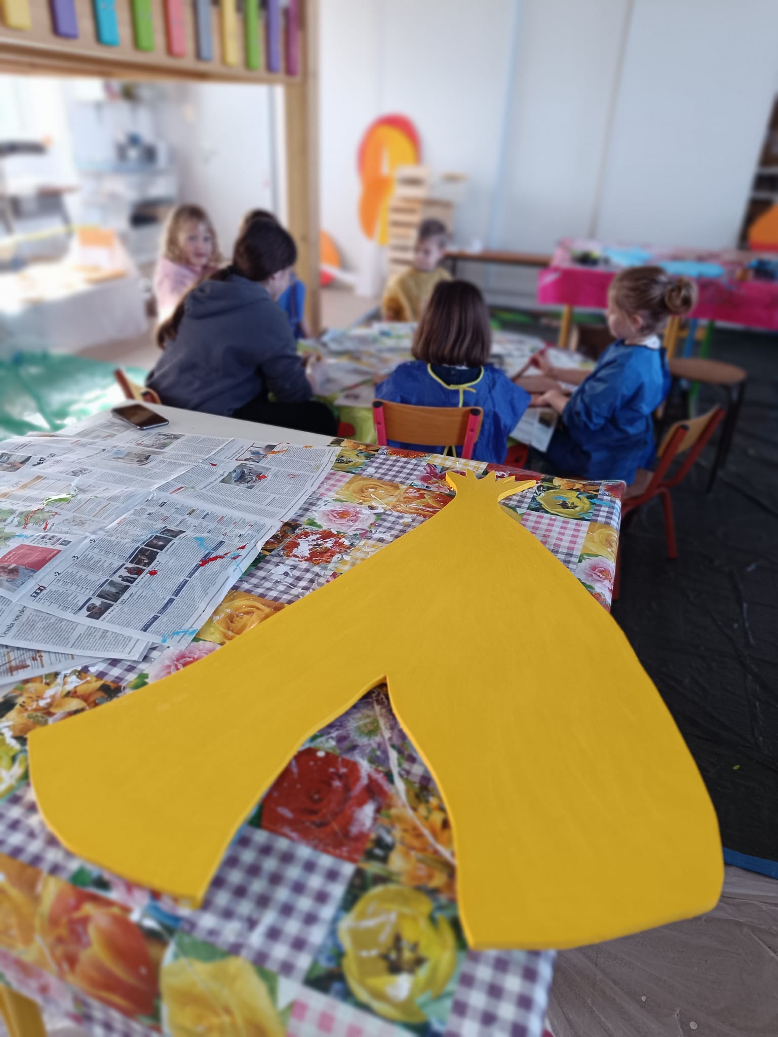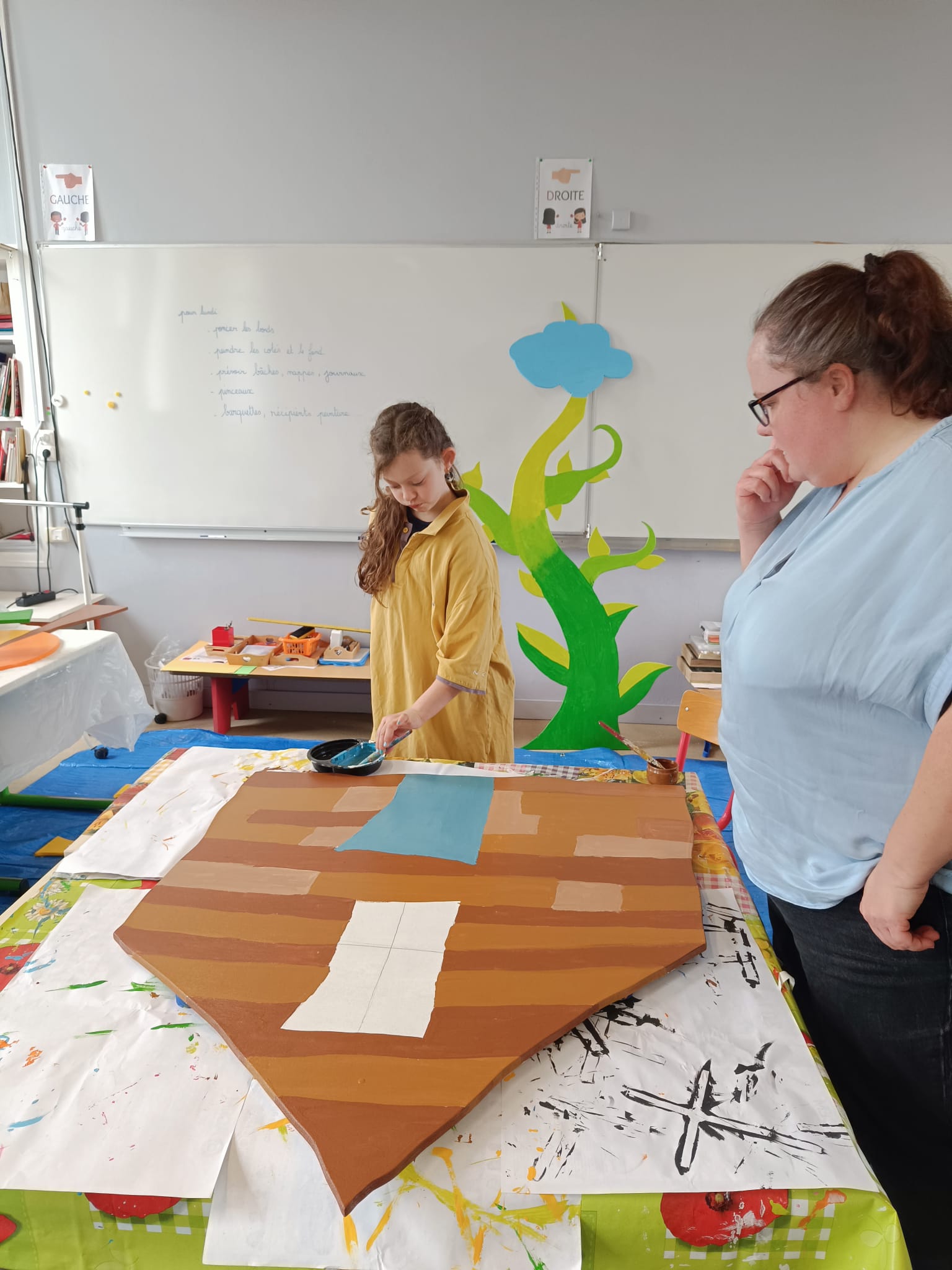 Les élèves ont dessiné des personnages, des lieux et des accessoires issus de leur imagination. Après une sélection rigoureuse, ces dessins ont été agrandis en format XXL sur des planches de bois. L’implication des familles a été essentielle, avec des parents et grands-parents participant à la découpe, au ponçage et à la peinture de la sous-couche.